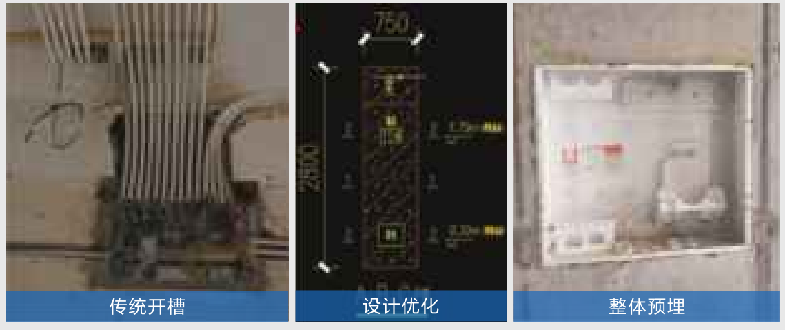 強弱電箱原圖紙在砌體上開槽后埋線盒子,再進行用砂漿修補,這樣在工人施工過程中容易鑿斷或者震裂砌墻,后期修補因砂漿過厚也會引起面層開裂。為確保質量,經過設計優(yōu)化,增加構造柱預埋線管及電箱,這樣不但解決開裂問題,加快了施工進度,大大消除了質量風險。