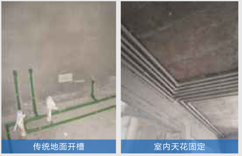 戶內水管安裝按照以往的做法會在建筑找平層開槽再進行預埋,裝修完成后如遇到滲漏水很難進行維修。為實現(xiàn)無后顧之憂,全部設置在天花,公共部位進行吊頂掩蓋,戶內走梁交接陰角,用木盒子裝修掩蓋,這樣不但解后期維修問題,樓板地面不再開槽,大大減少建筑找平厚度,使戶內凈高空間增大。