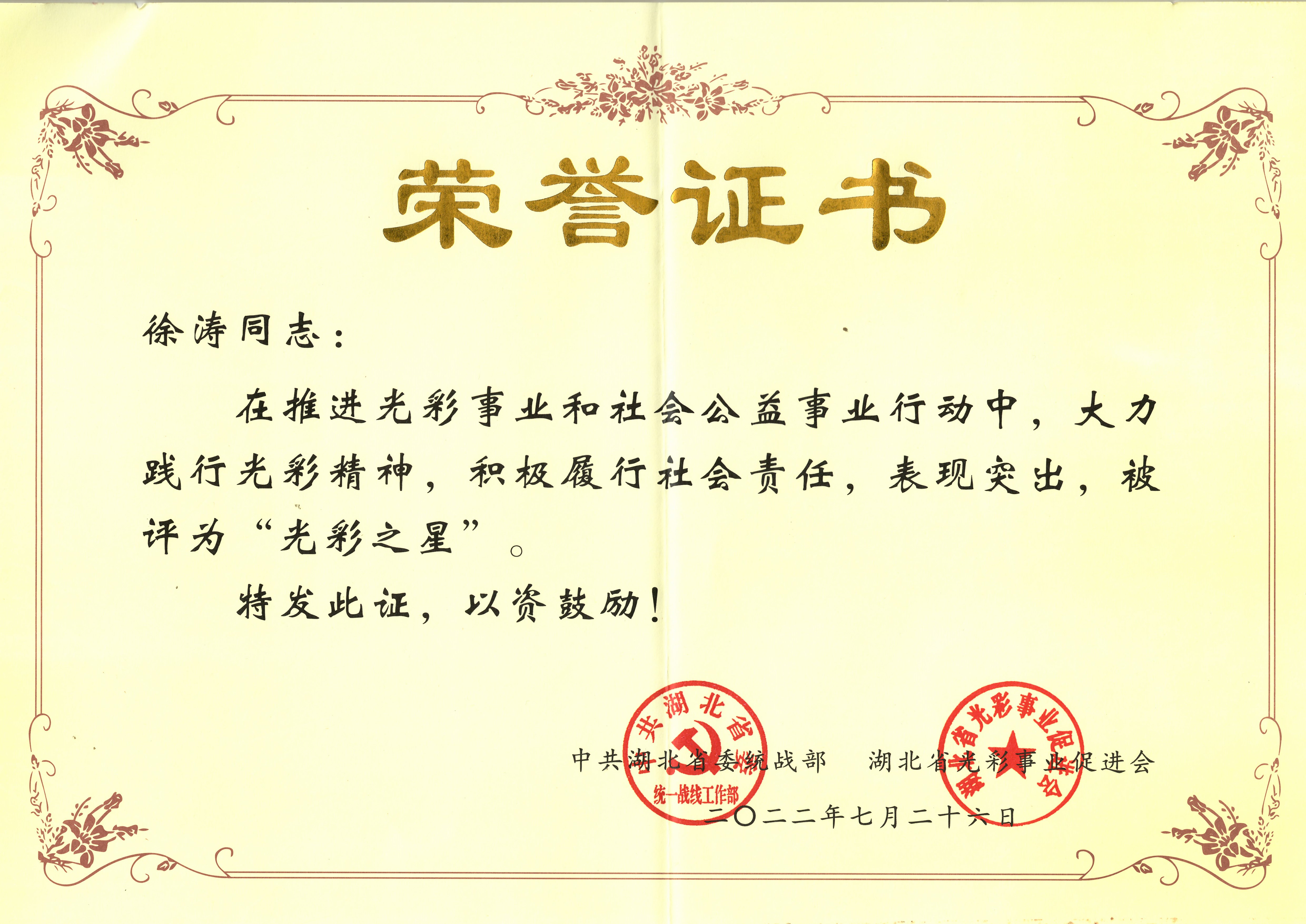 近日,由中共湖北省委統(tǒng)戰(zhàn)部、省光彩事業(yè)促進(jìn)會共同評選60名民營經(jīng)濟(jì)人士“光彩之星”表彰會在恩施召開。會議表彰了一批熱心公益事業(yè)、積極回報社會的優(yōu)秀非公有制經(jīng)濟(jì)人士,湖北大集建設(shè)集團(tuán)有限公司董事長、武漢閱景匯投資發(fā)展有限公司董事長徐濤榮獲全省“光彩之星”榮譽稱號!